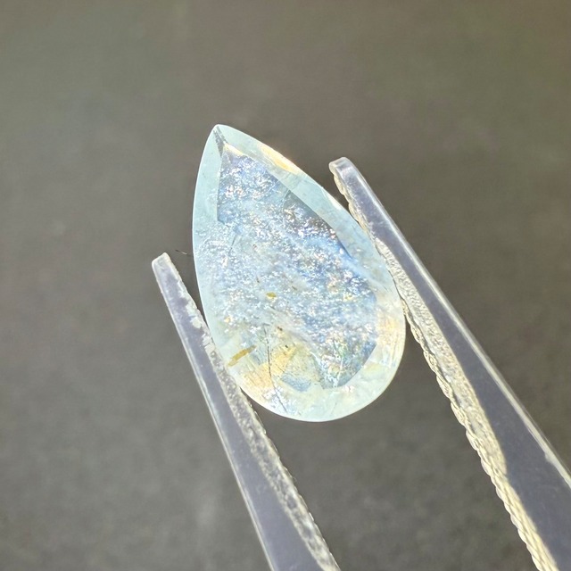 産地:ブラジル 石名:イリデッセンスアクアマリン 通称:シンデレラアクアマリン 2.15ct 8.01×10.47mm アクアマリンの爽やかなブルーにイリデッセンスの虹がたっぷりと入った新しいアクアマリンです。 通常のアクアマリンよりインクルージョン、クラック、フラクチャーなどが多く見受けられます。 この特徴により一石一石に個性が光ります。 状態はお写真でご確認ください。