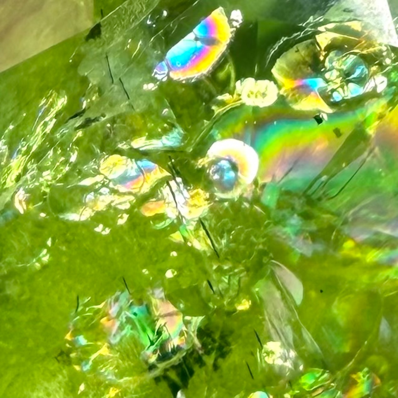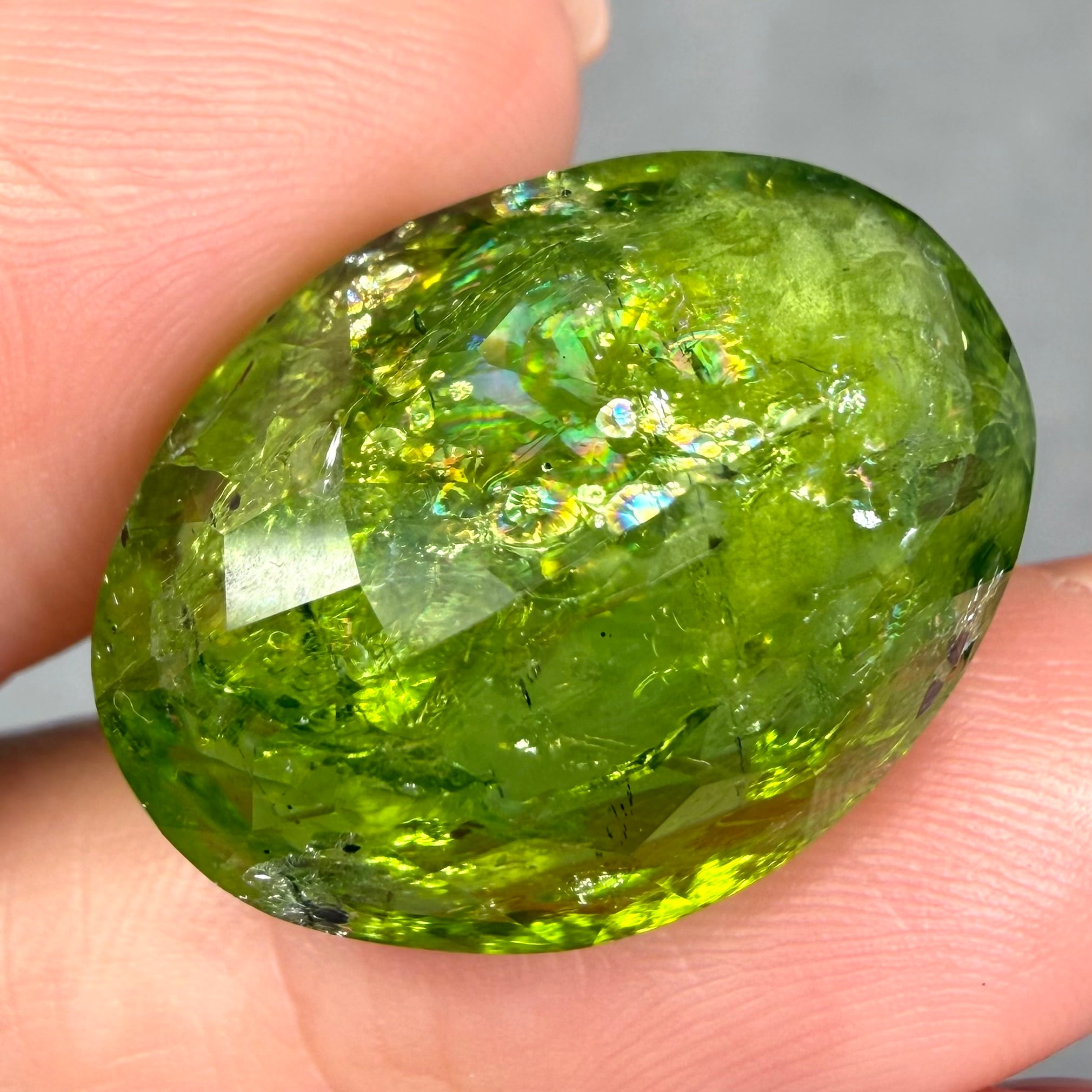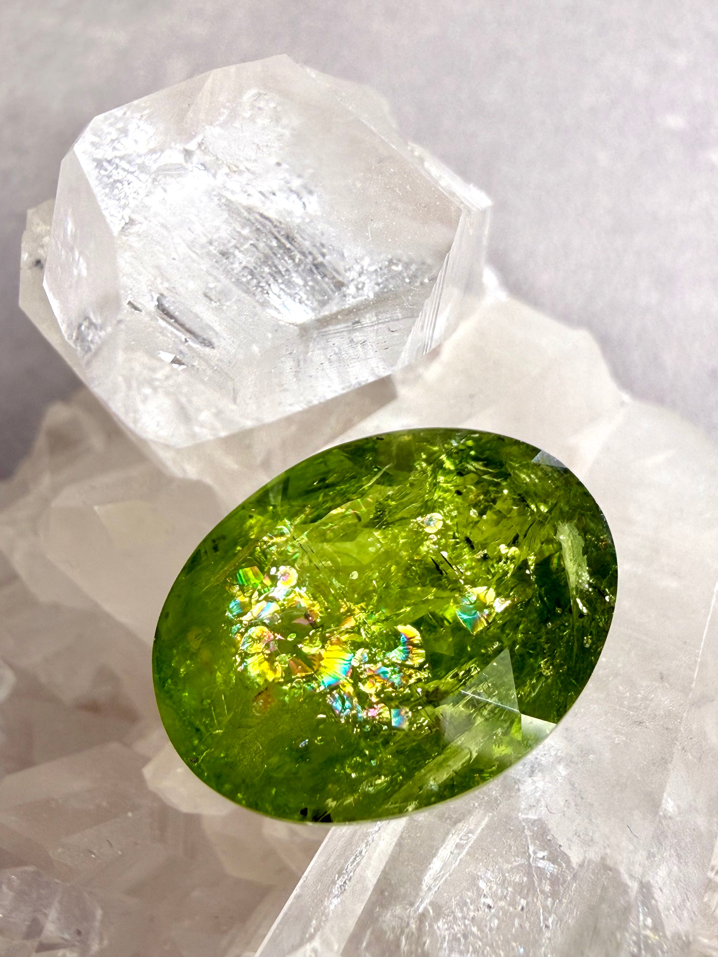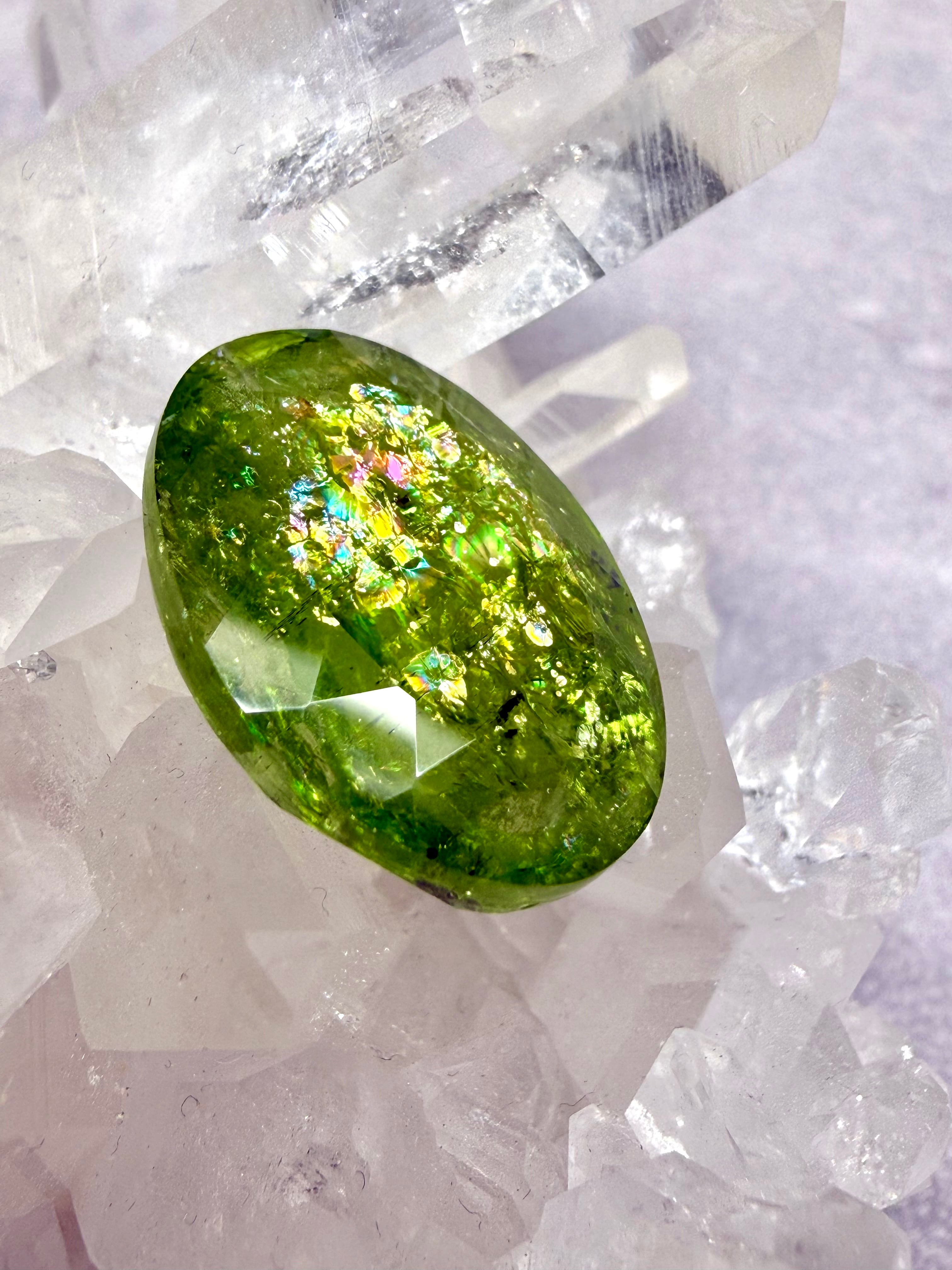 ペリドットに多いブラックポイントは少し見受けられますが、目立つクラックや激しめのチップはございません。