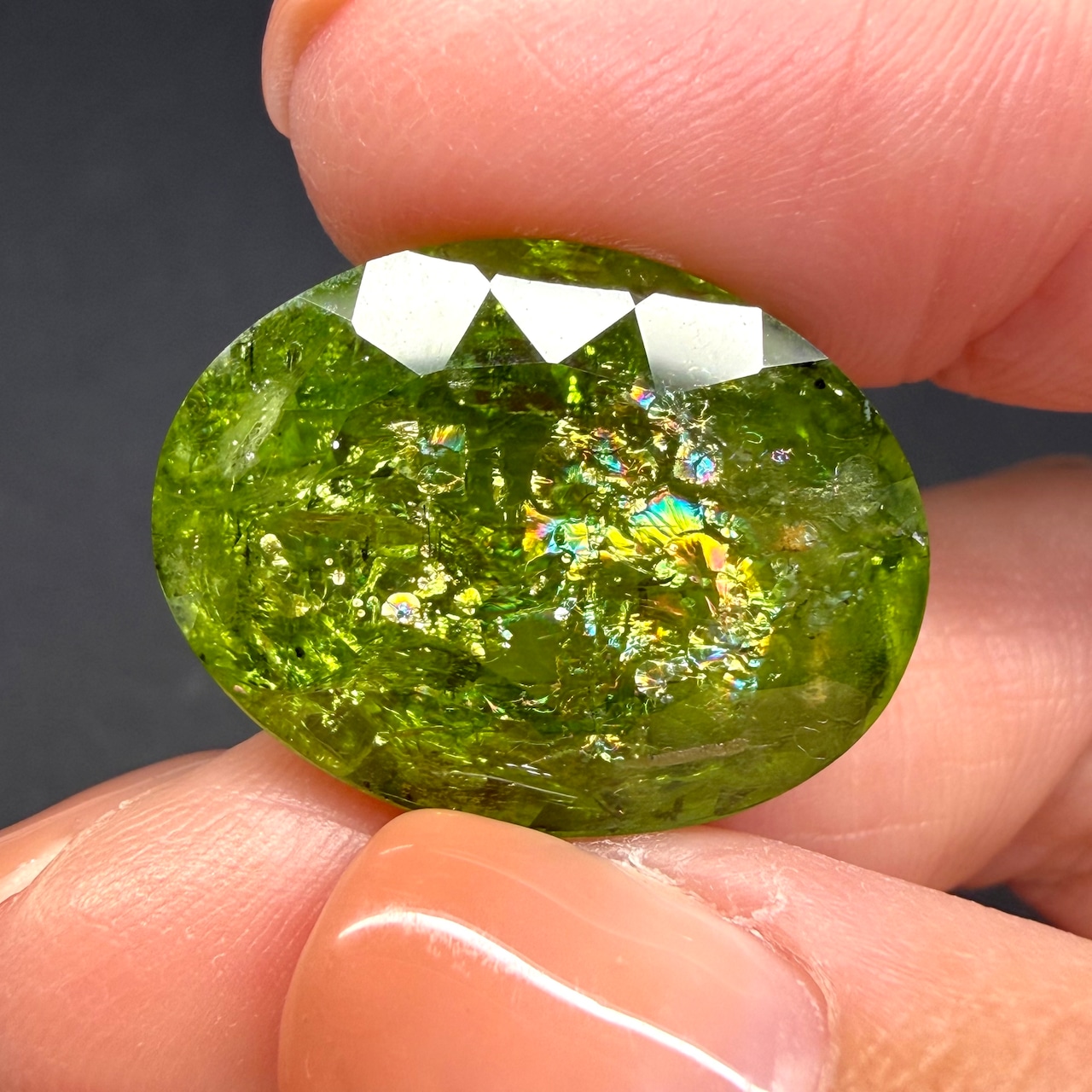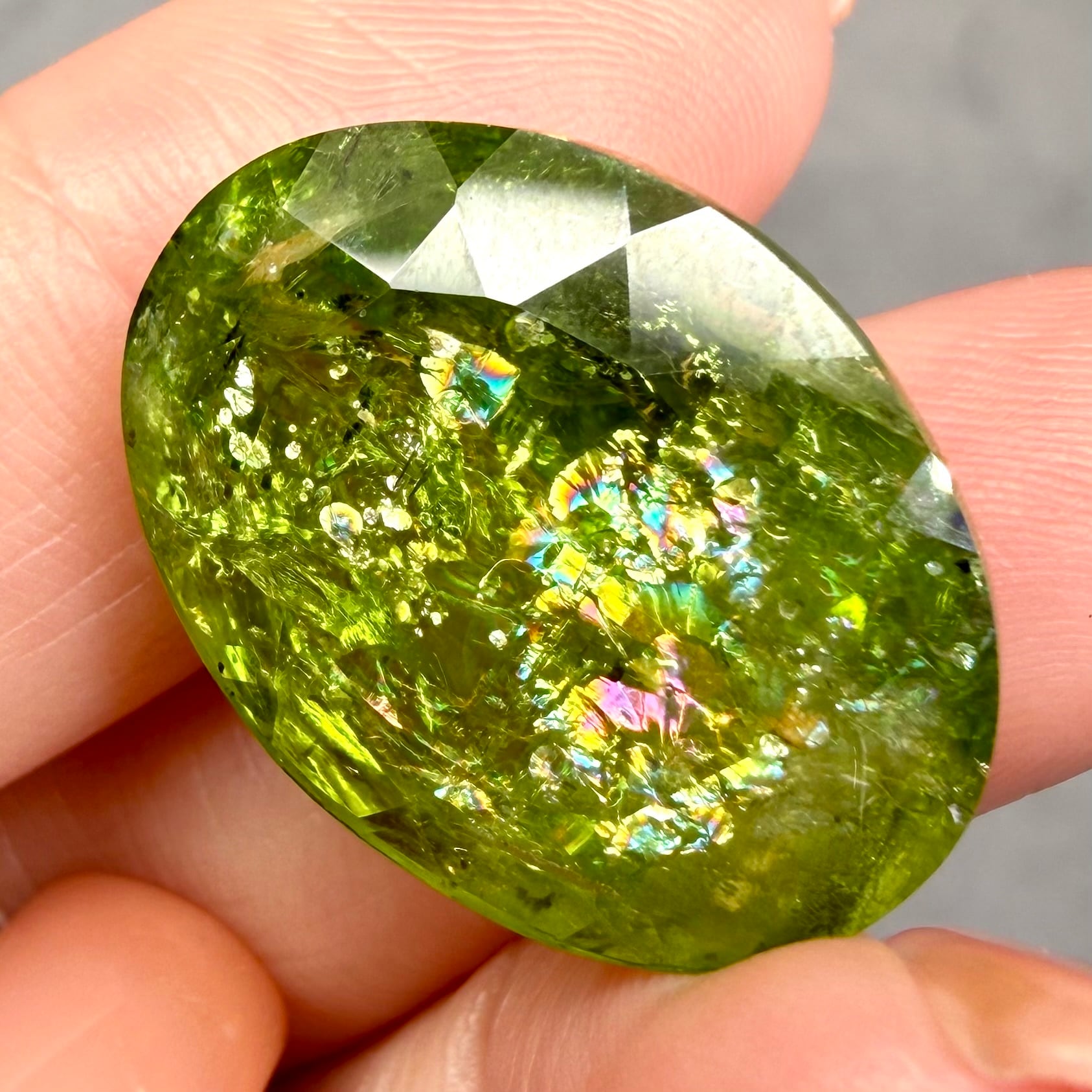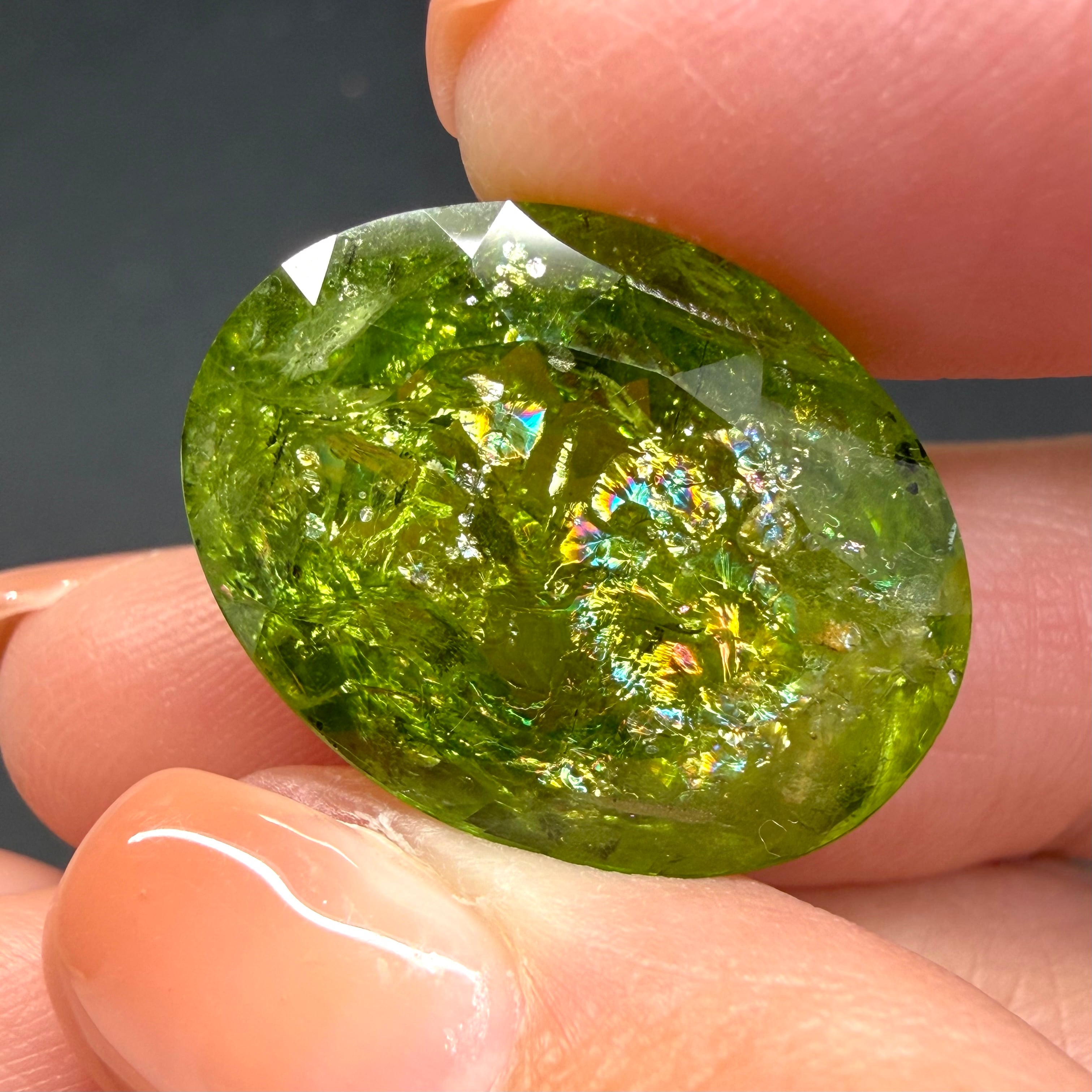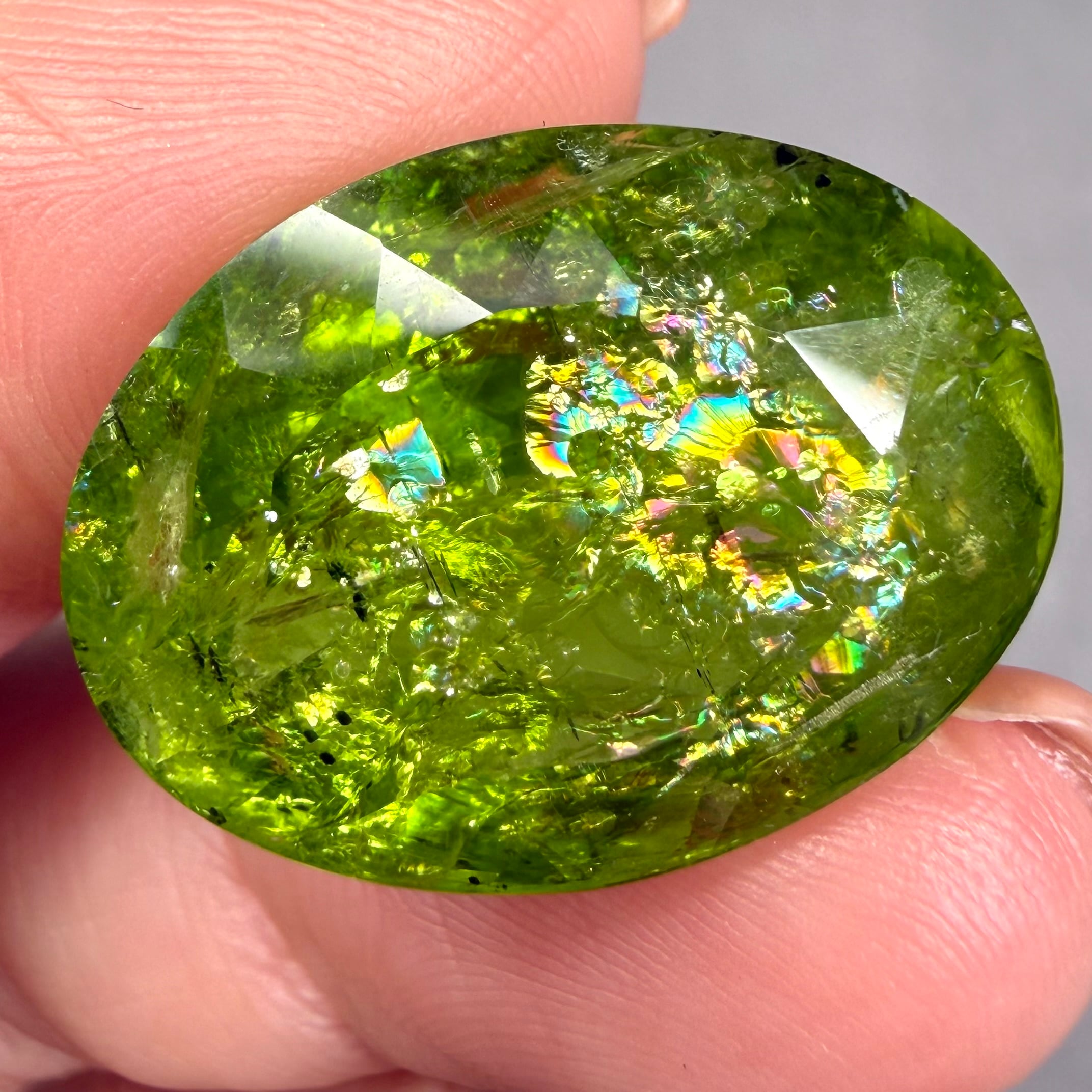 ペリドットに多いブラックポイントは少し見受けられますが、目立つクラックや激しめのチップはございません。