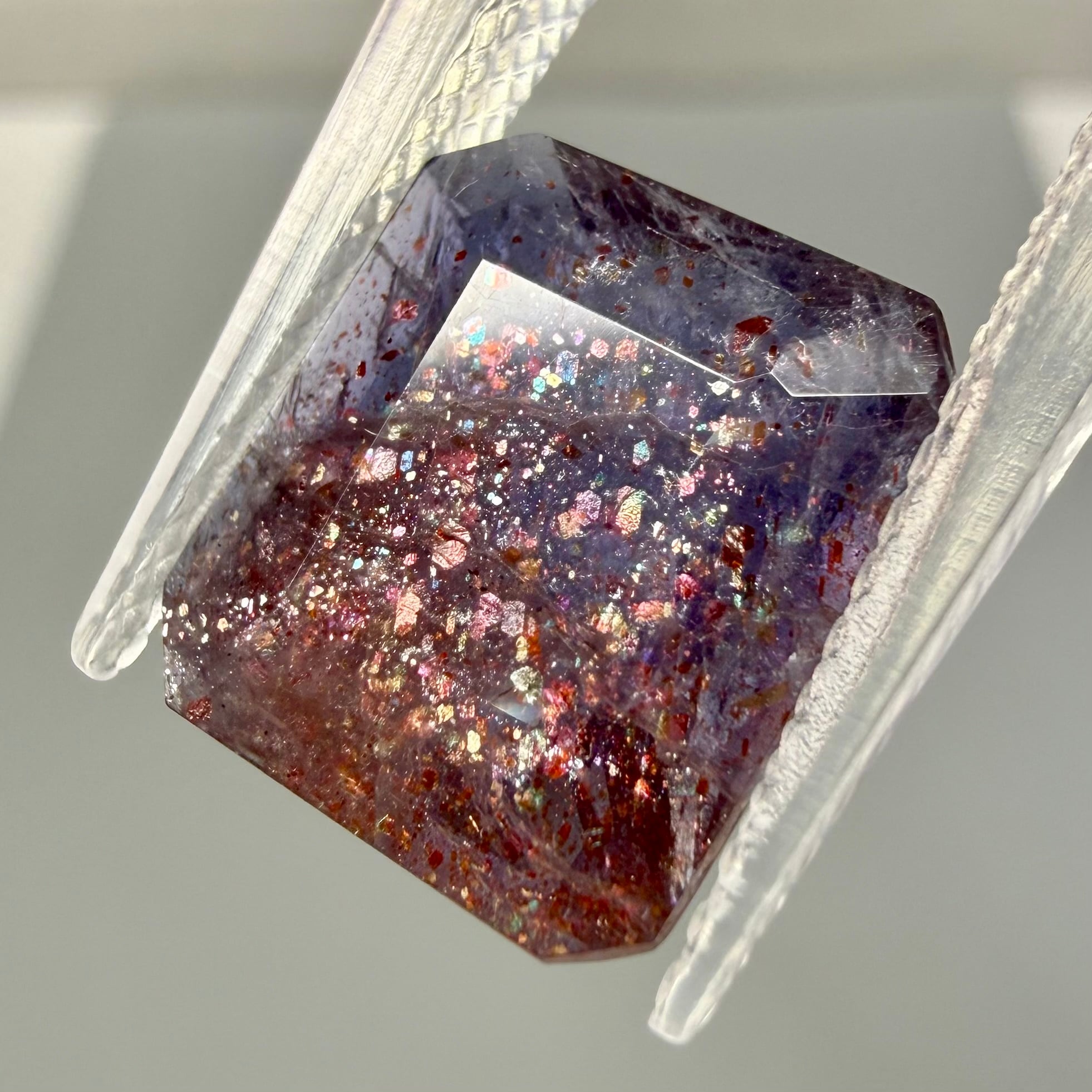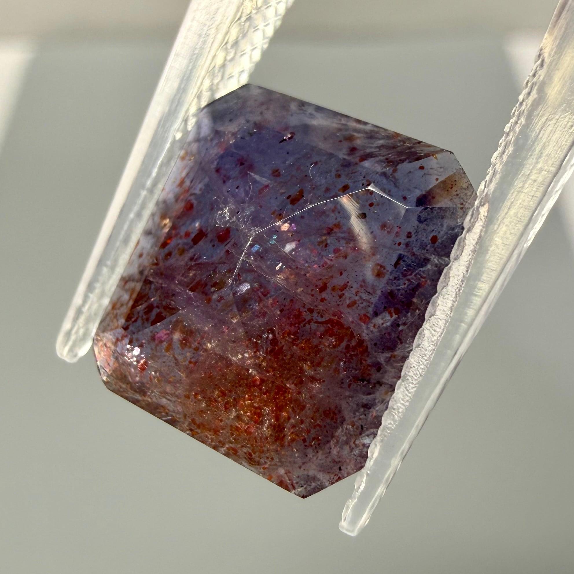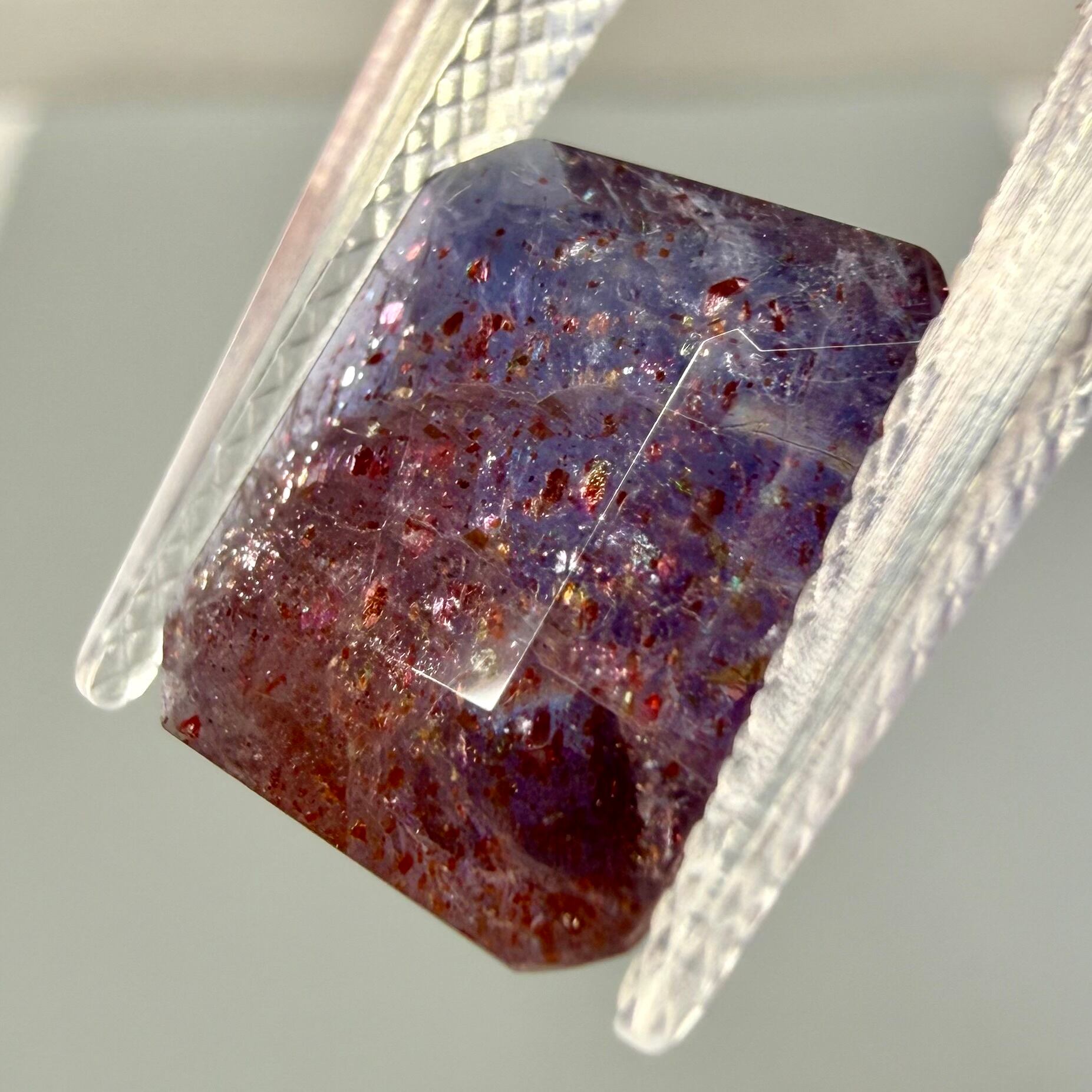 すみれ色のアイオライト内にレピドクロサイト(鱗鉄鉱)などのインクルージョンがキラキラと輝く華やかな一石です。ブラッドショットは赤いラメのようなインクルージョンが入った珍しいカラーです。