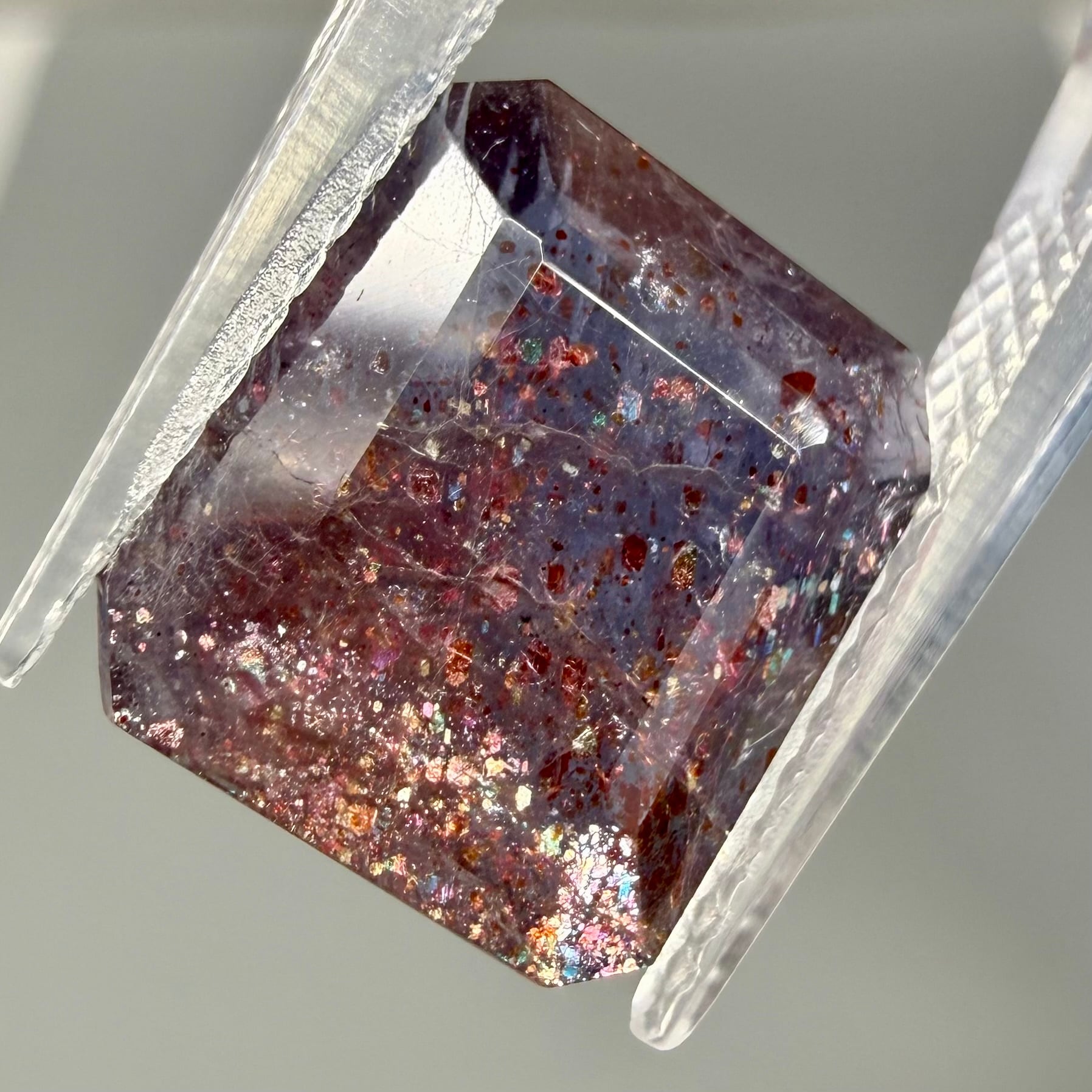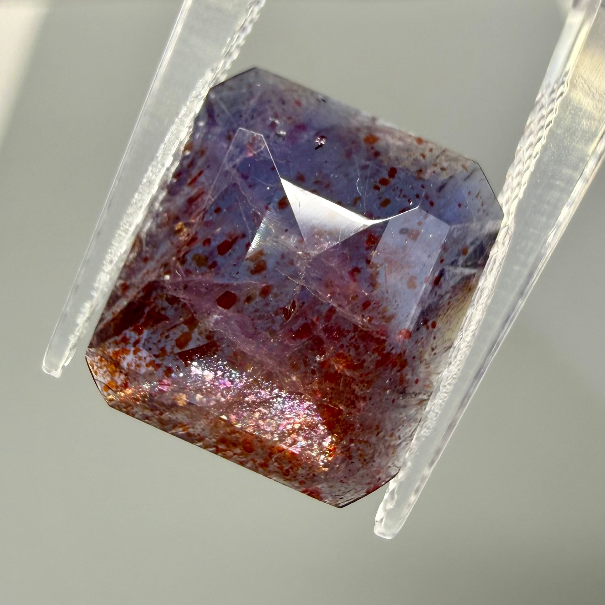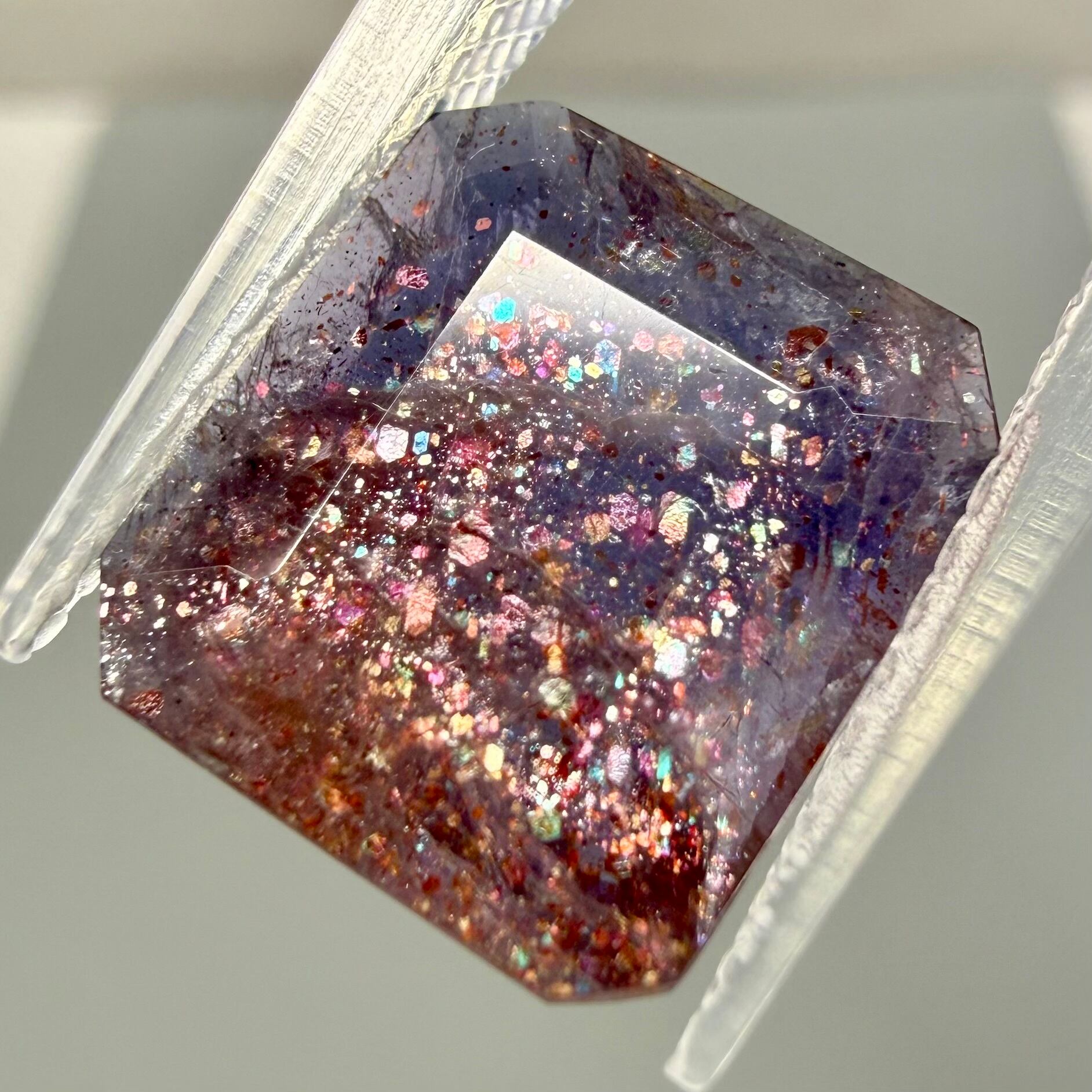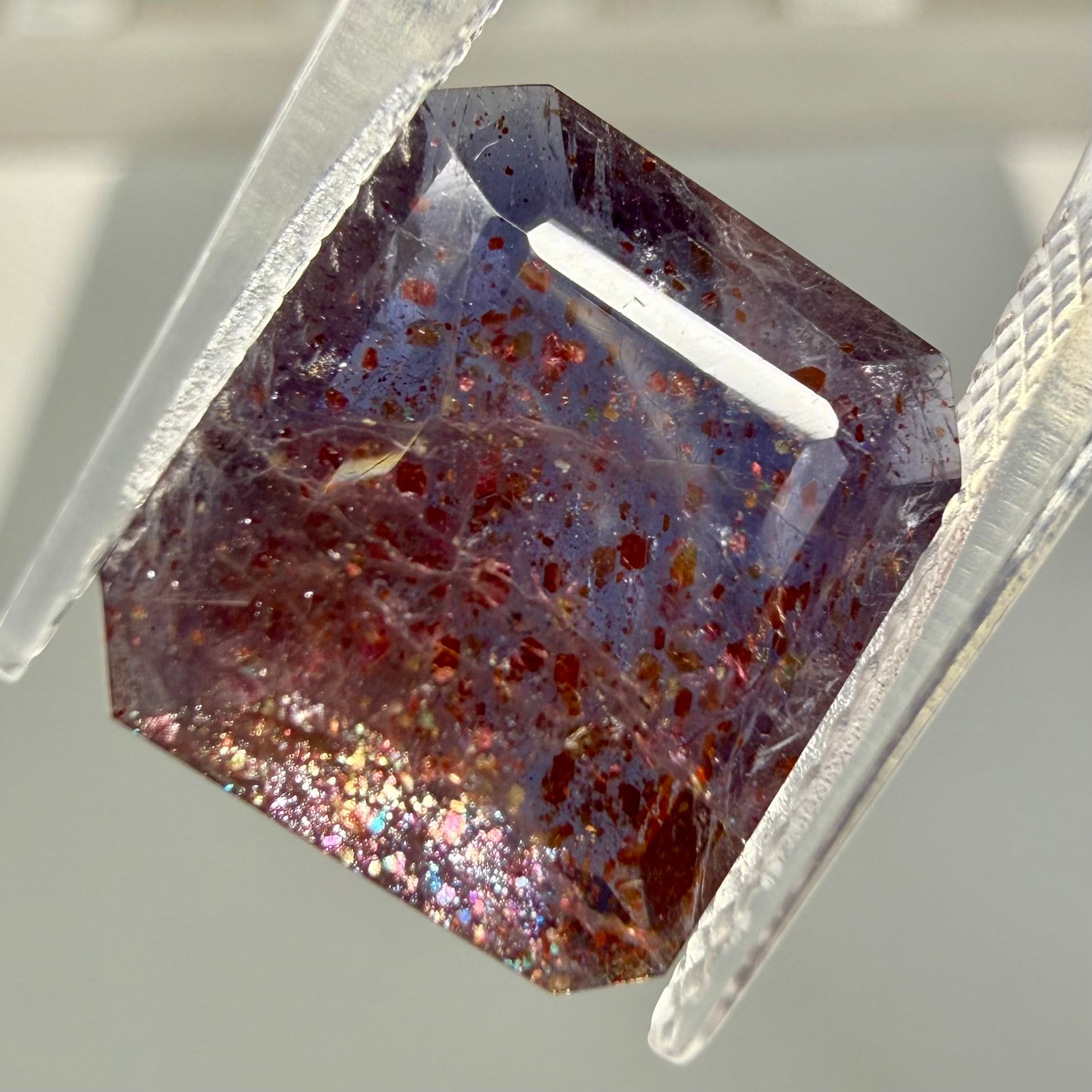 すみれ色のアイオライト内にレピドクロサイト(鱗鉄鉱)などのインクルージョンがキラキラと輝く華やかな一石です。ブラッドショットは赤いラメのようなインクルージョンが入った珍しいカラーです。