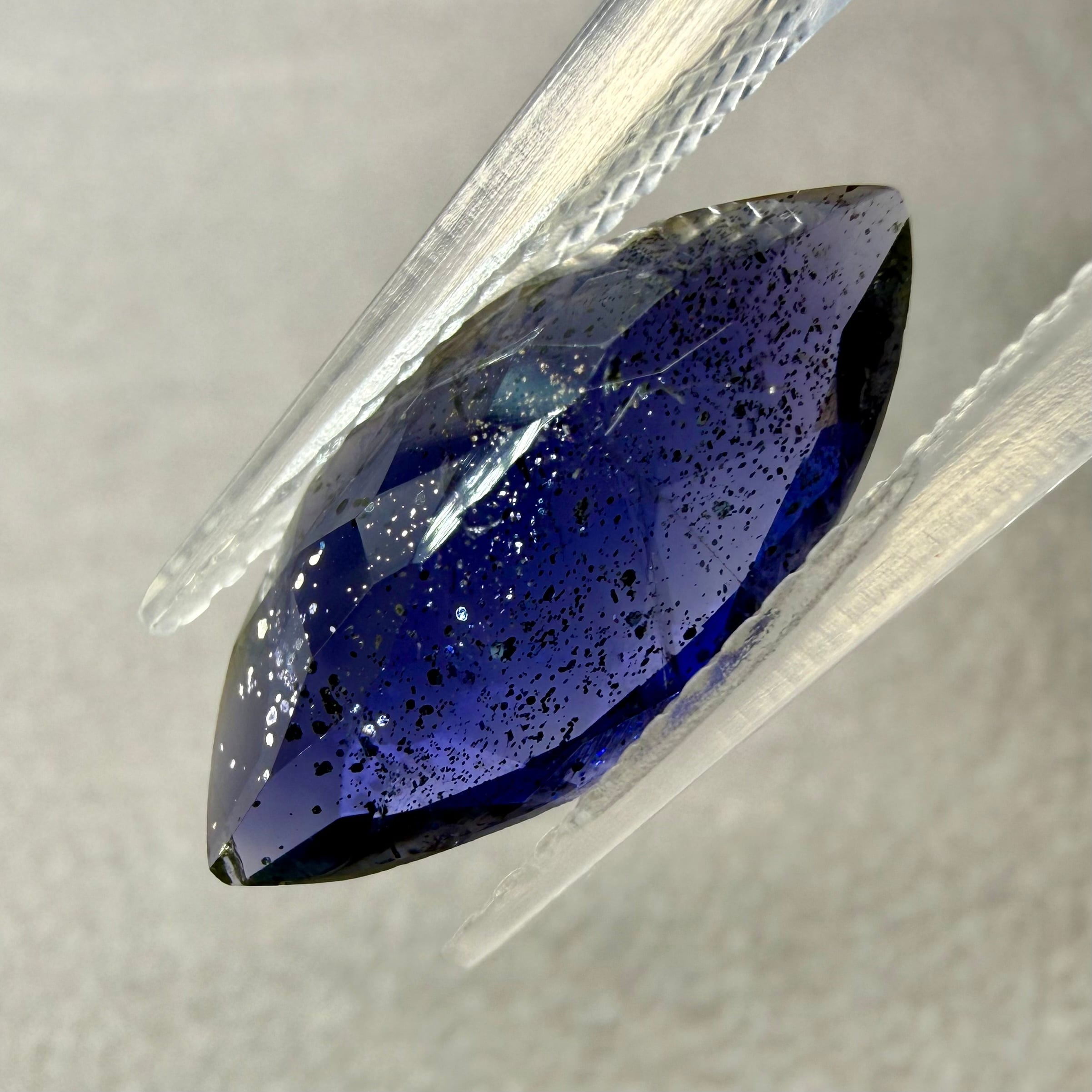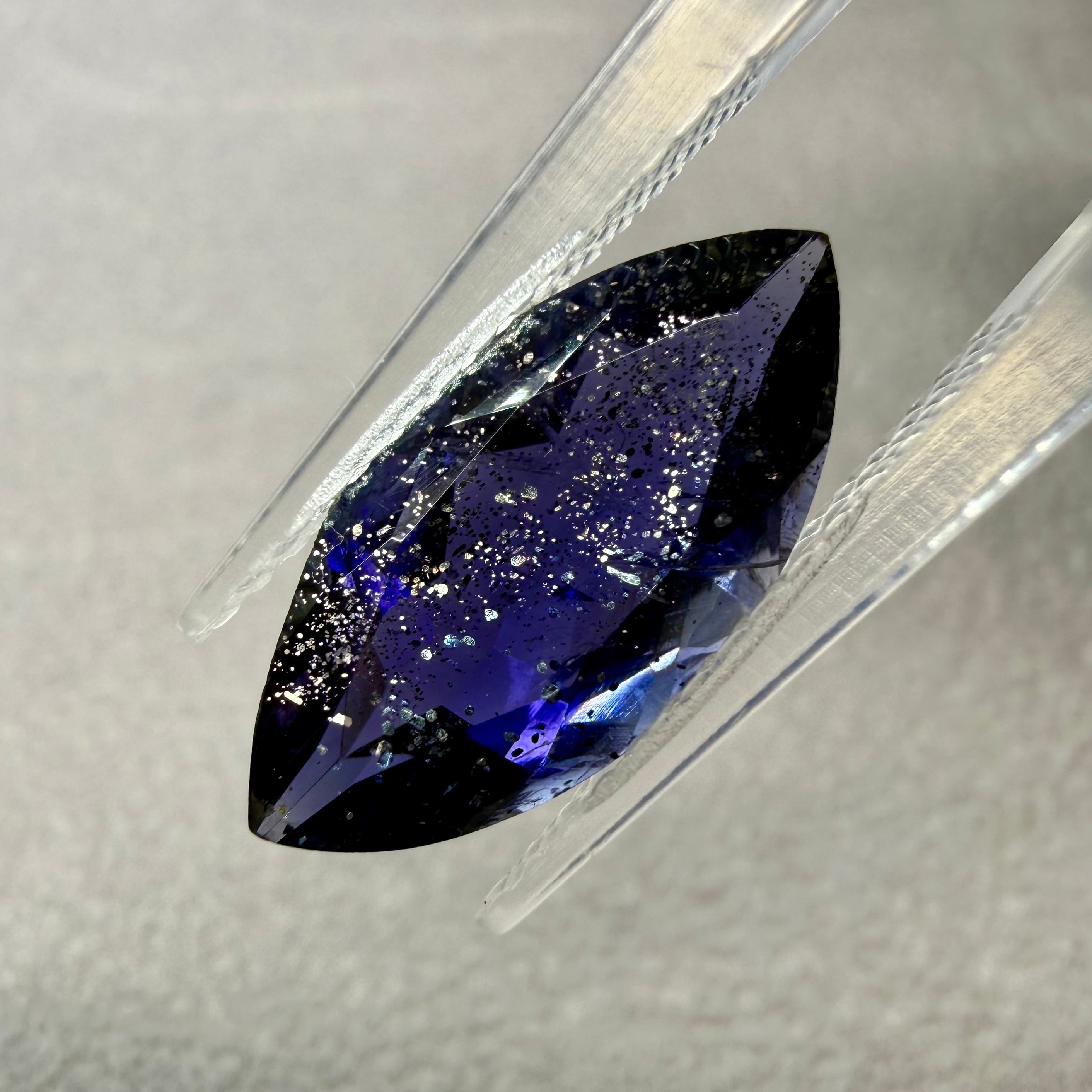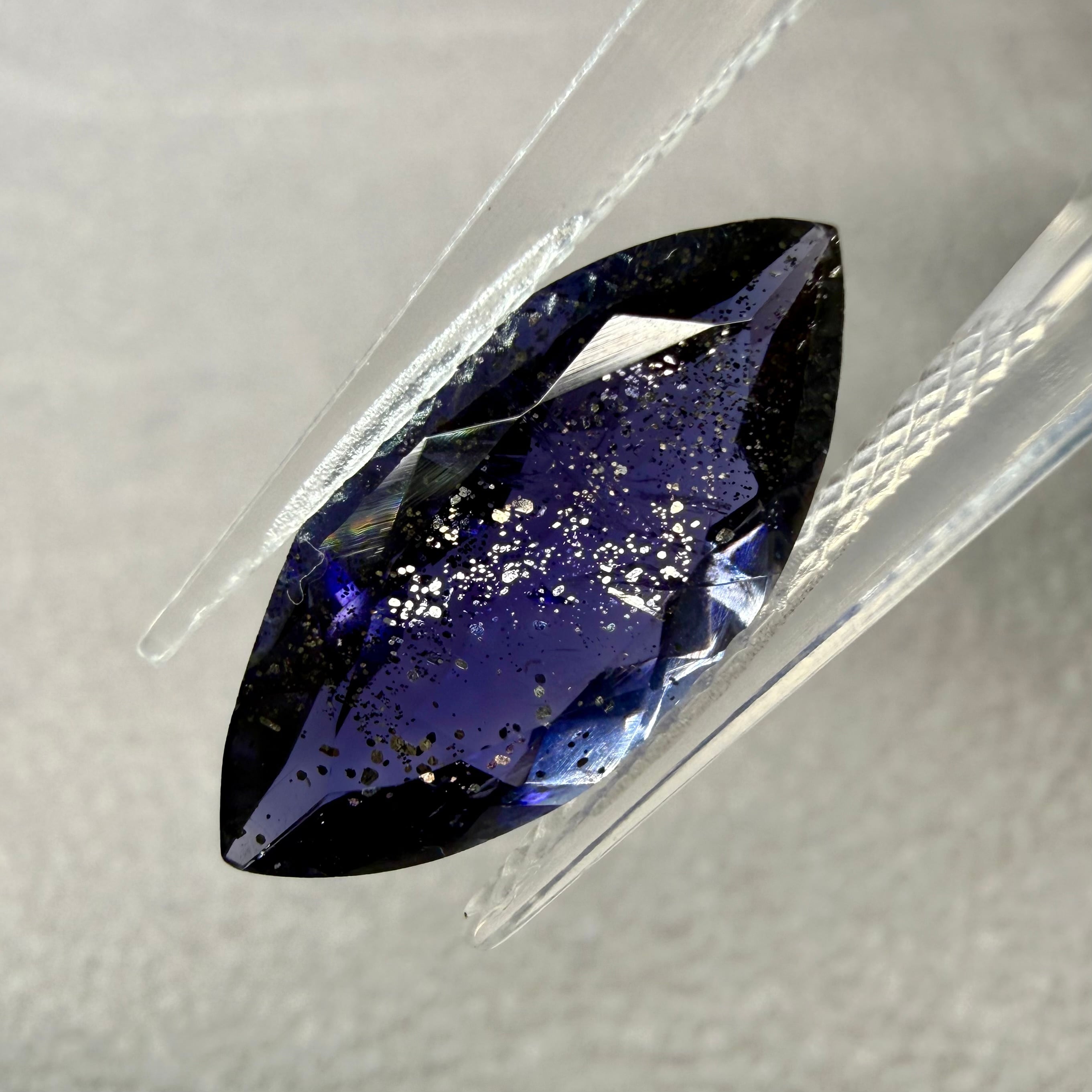 こちらのルースは、濃くテリのいい藍色、透明感のあるアイオライトにシルバーやゴールドのラメがチラチラ輝く夜空のような一石です。まるで夜空に浮かぶ星雲のようです。